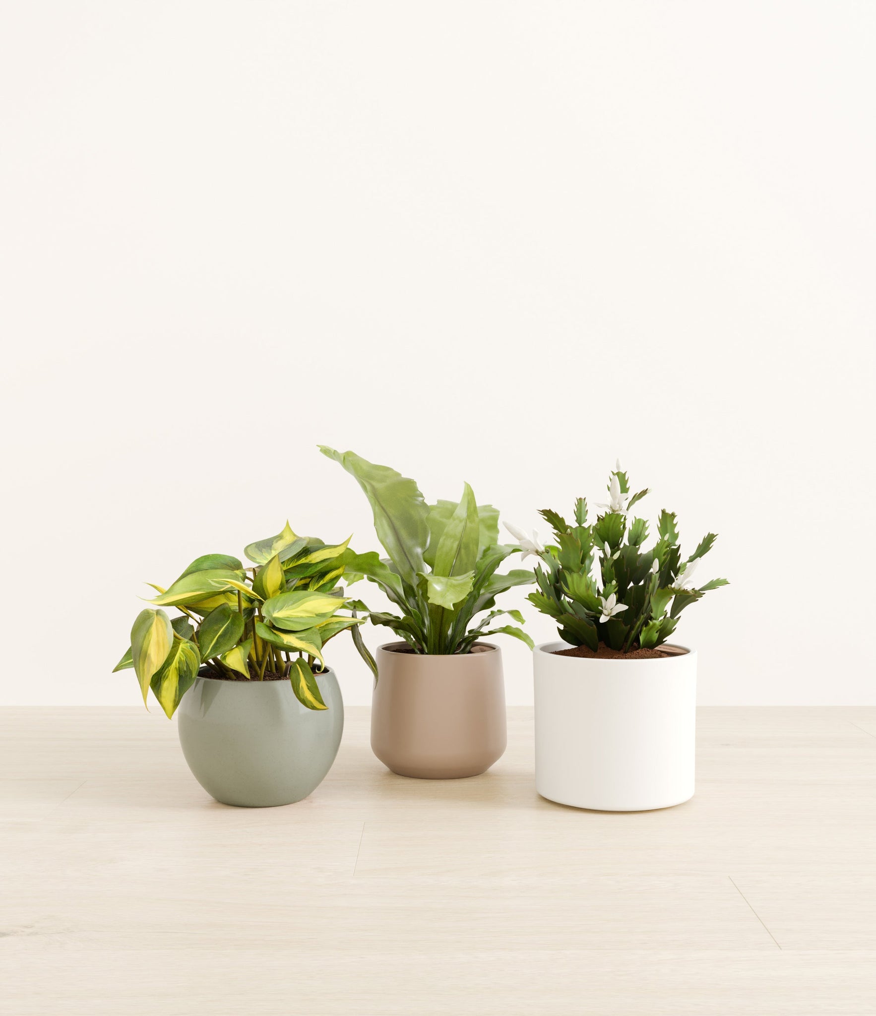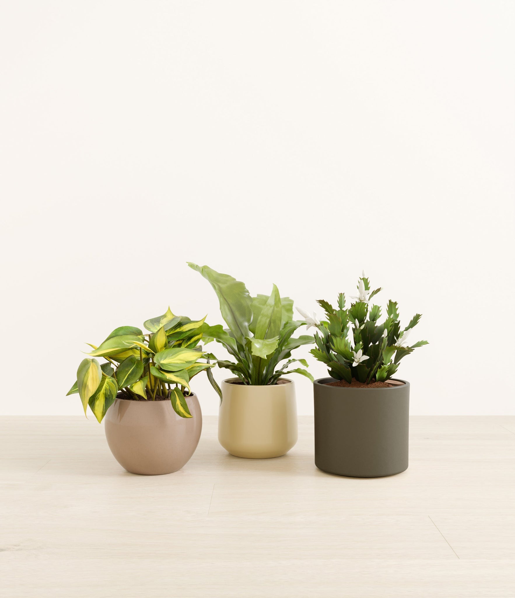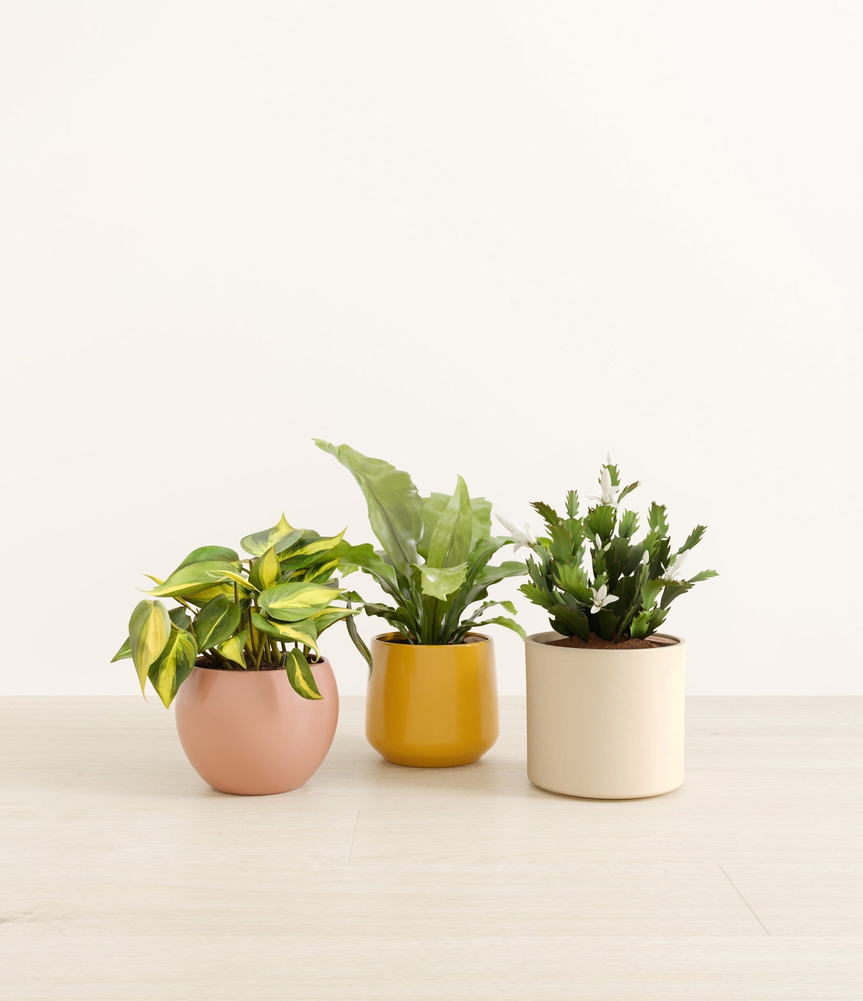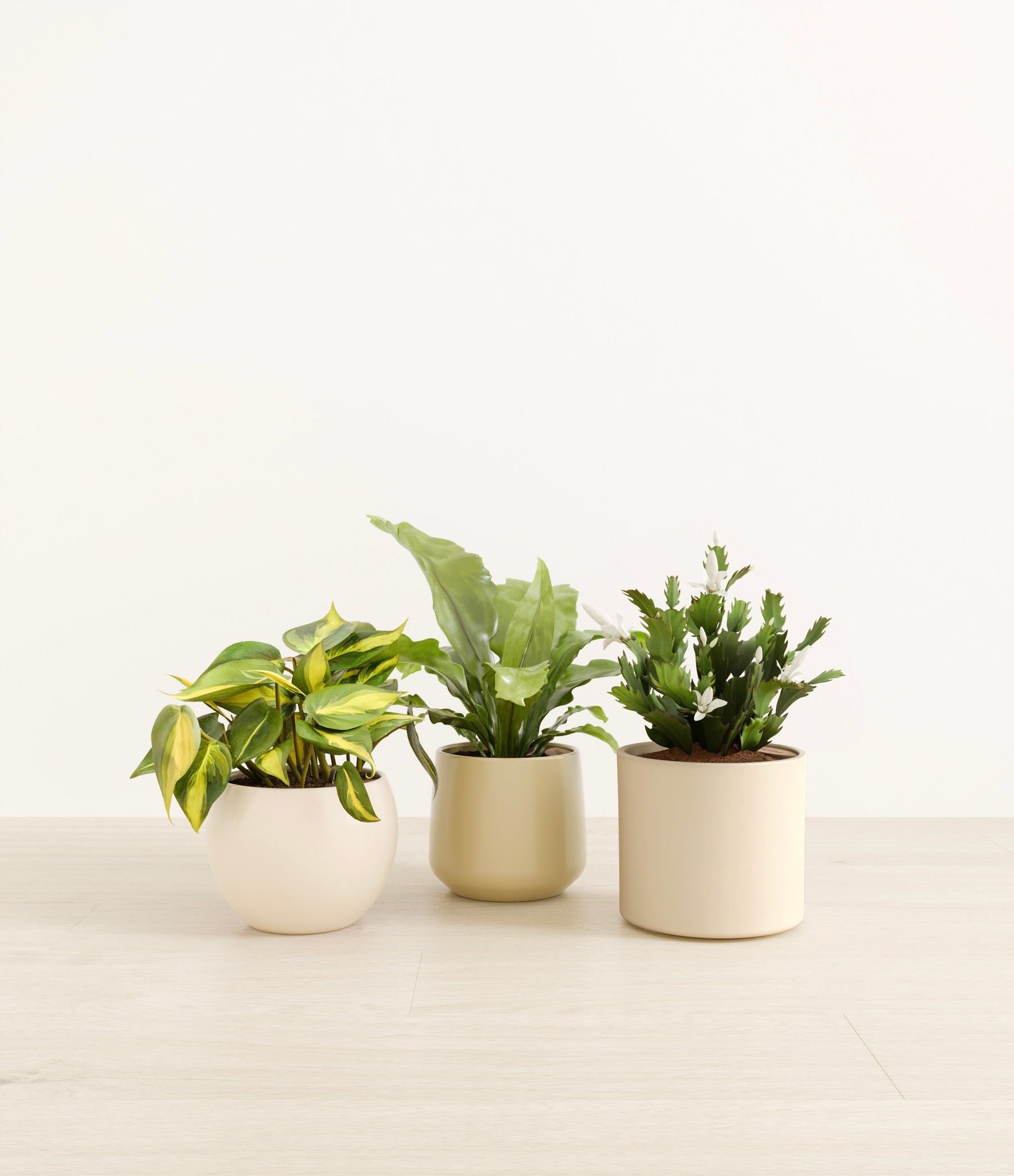 Embrace the cozy comfort of autumn with a vibrant trio of houseplants that epitomize the warmth and charm of the season. This collection features a medium Birds Nest Fern, bringing a touch of lush, natural elegance with its rippling fronds; a medium Holiday Cactus, celebrated for its festive blooms that enliven any setting; and a medium Philodendron Brazil, with its vibrant cascades of green and gold. Together, these plants create a harmonious atmosphere, perfect for enhancing indoor spaces and celebrating the tranquil spirit of Thanksgiving.